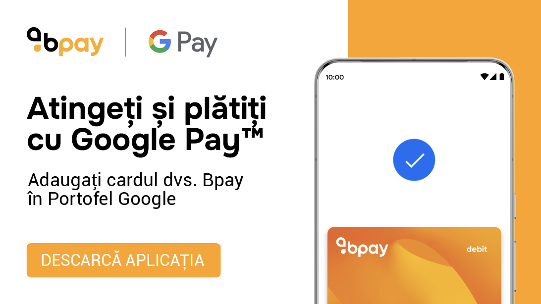 În loc să scoateți cardul din portofel, plătiți direct cu telefonul. Este suficient să adăugați cardul Bpay în aplicația Portofel Google și veți putea efectua plăți contactless în magazine, restaurante, transport sau online, oriunde vedeți simbolul Google Pay sau Contactless.